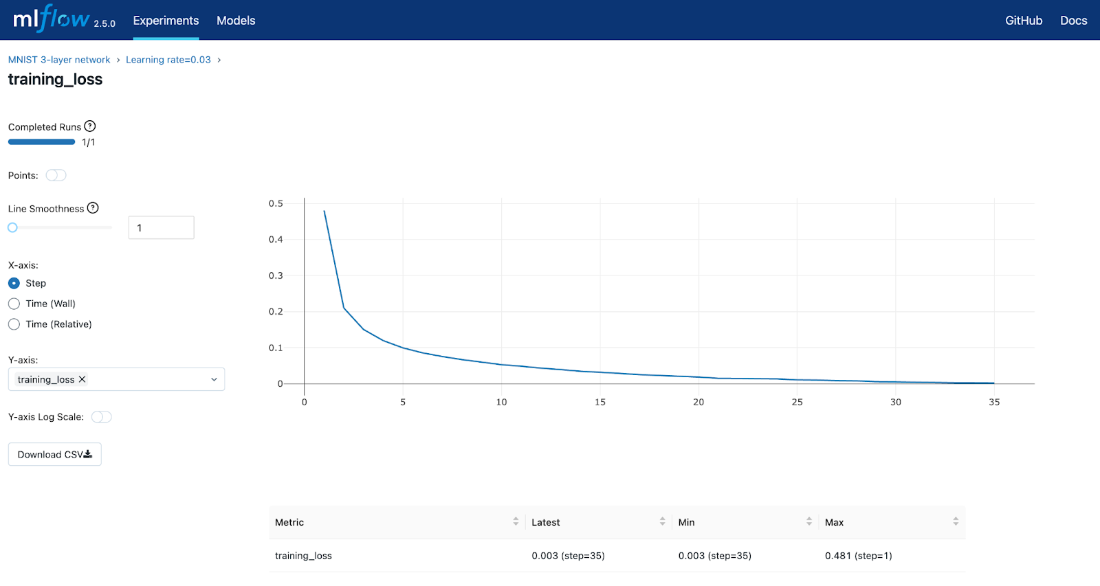 The default view is the table view. You can pick the columns that are displayed. From here, you can drill into a specific run if you want to view its parameters and metrics. Selecting a run and clicking on the `training_loss` metric will produce the graph below. As you can see, it looks like the loss function starts to level off around 35. Additional epochs would not produce better results.