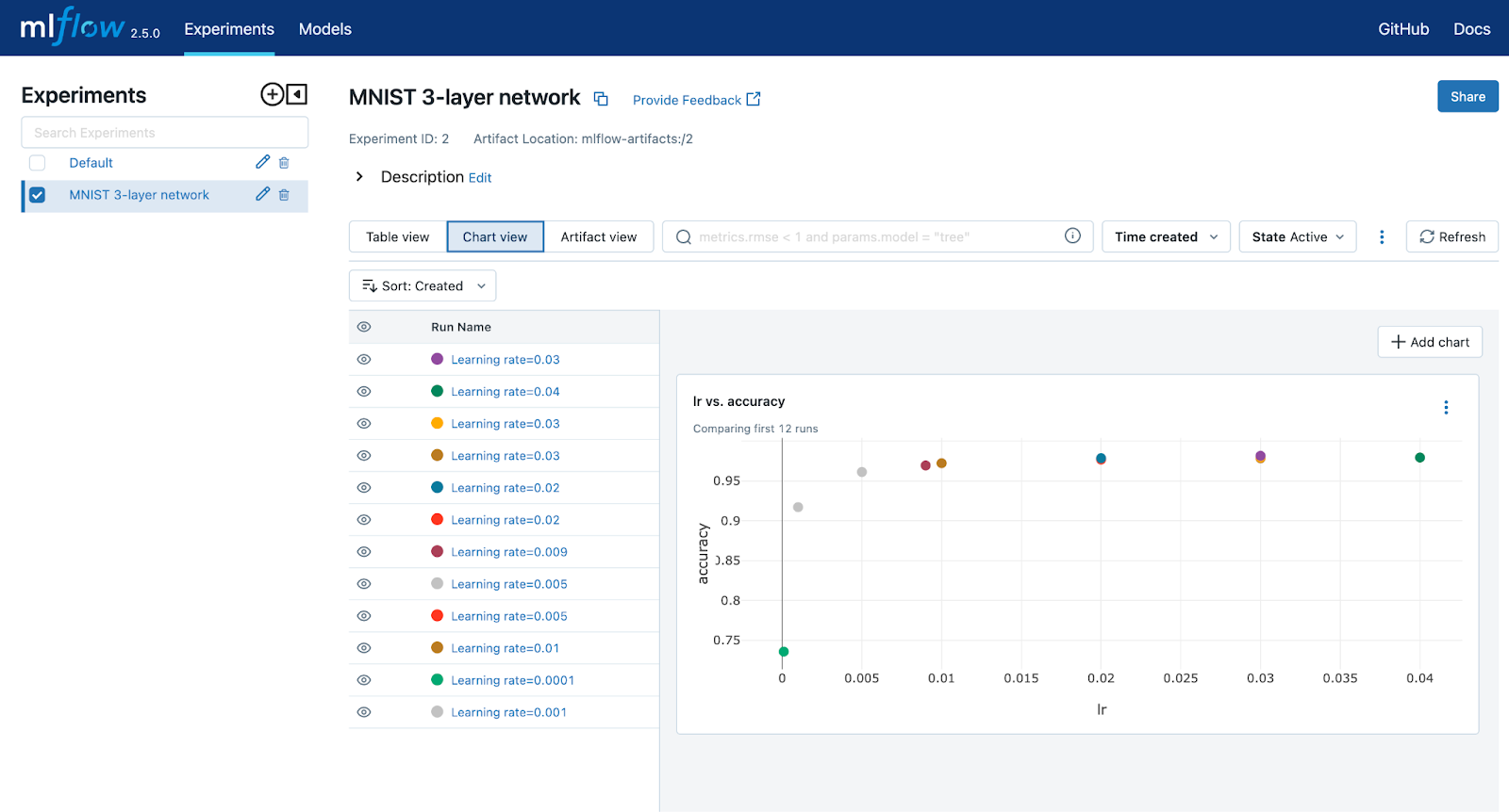Going back to the home page and clicking on the Chart view button takes you to a page where you can create charts. I created a chart that shows the relationship of learning rate to accuracy. You can create as many charts as you wish. These charts will show the relationship of whatever parameter and metrics you chose across runs within the experiment.