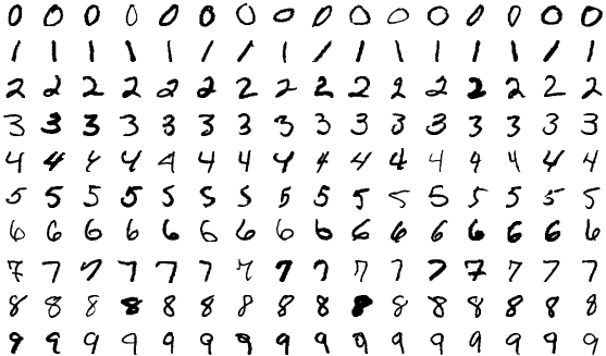 The Modified National Institute of Standards and Technology (MNIST) dataset is a collection of handwritten digits. It is one of the most well-known datasets in the ML community, and it is commonly used as an introduction to building neural networks. Each image is a 28 x 28 pixel image of a hand written number between 0 and 9. Below are a few samples of each number in the dataset. The creators of this dataset have already designated the images to be used for training and testing. There are 60,000 images for training and 10,000 for testing.