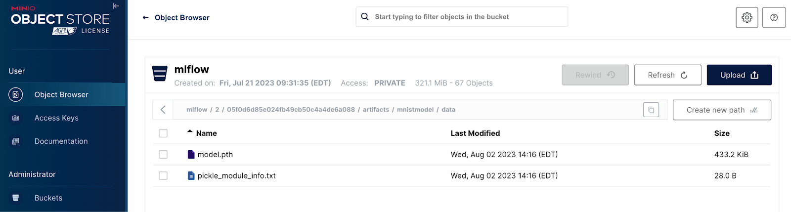 The `Full Path` property is a clue as to where to find this artifact in MinIO. Remember that when we installed MLflow we set up a single bucket within MinIO to be used by MLflow. This bucket was named `mlflow`. Let’s look at the contents of this bucket via the MinIO UI. This is shown below.
