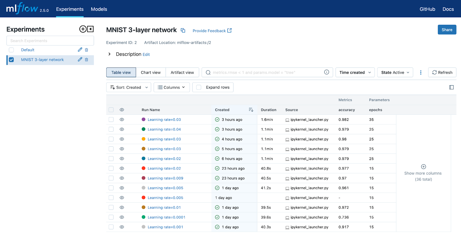 How did we do? Using the code presented in this post, I was able to get 98.2% accuracy against the test set. However, what is more interesting than the result is the metrics collected during all my experiments. Let’s take a look at them now via the MLflow UI.