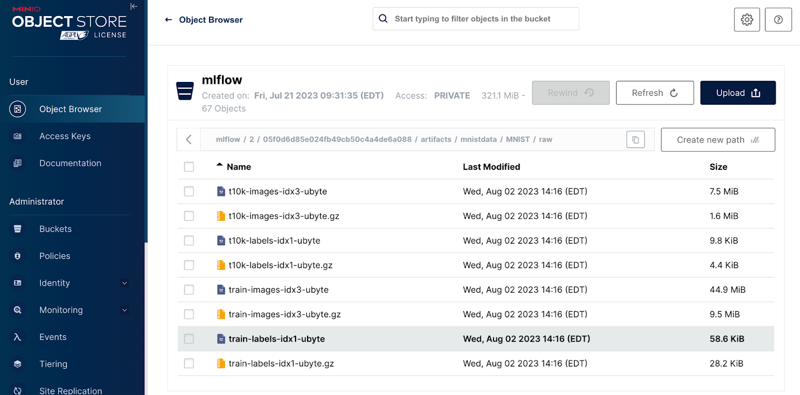 MLflow Tracking is an easy-to-use tool for tracking (or logging) parameters, metrics, and artifacts. In this post, we used the MNIST dataset to demonstrate parameter tracking, metric tracking and artifact tracking. We also explored the MLflow UI’s reporting capabilities where we saw a lot of useful reports that could be used for improving model performance. Finally, we looked under the hood and showed how MLflow uses MinIO for storing artifacts.