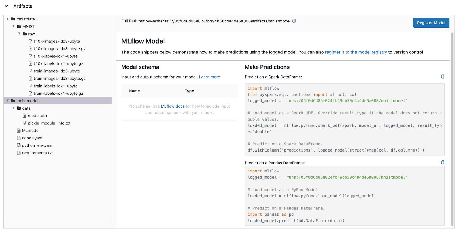 Finally, note the `mnistdata` path. This is the raw data that we logged using `mlflow.log_artifacts()` with an artifact_path of `mnistdata`. The compressed objects you see here are the files that Pytorch downloaded for us.