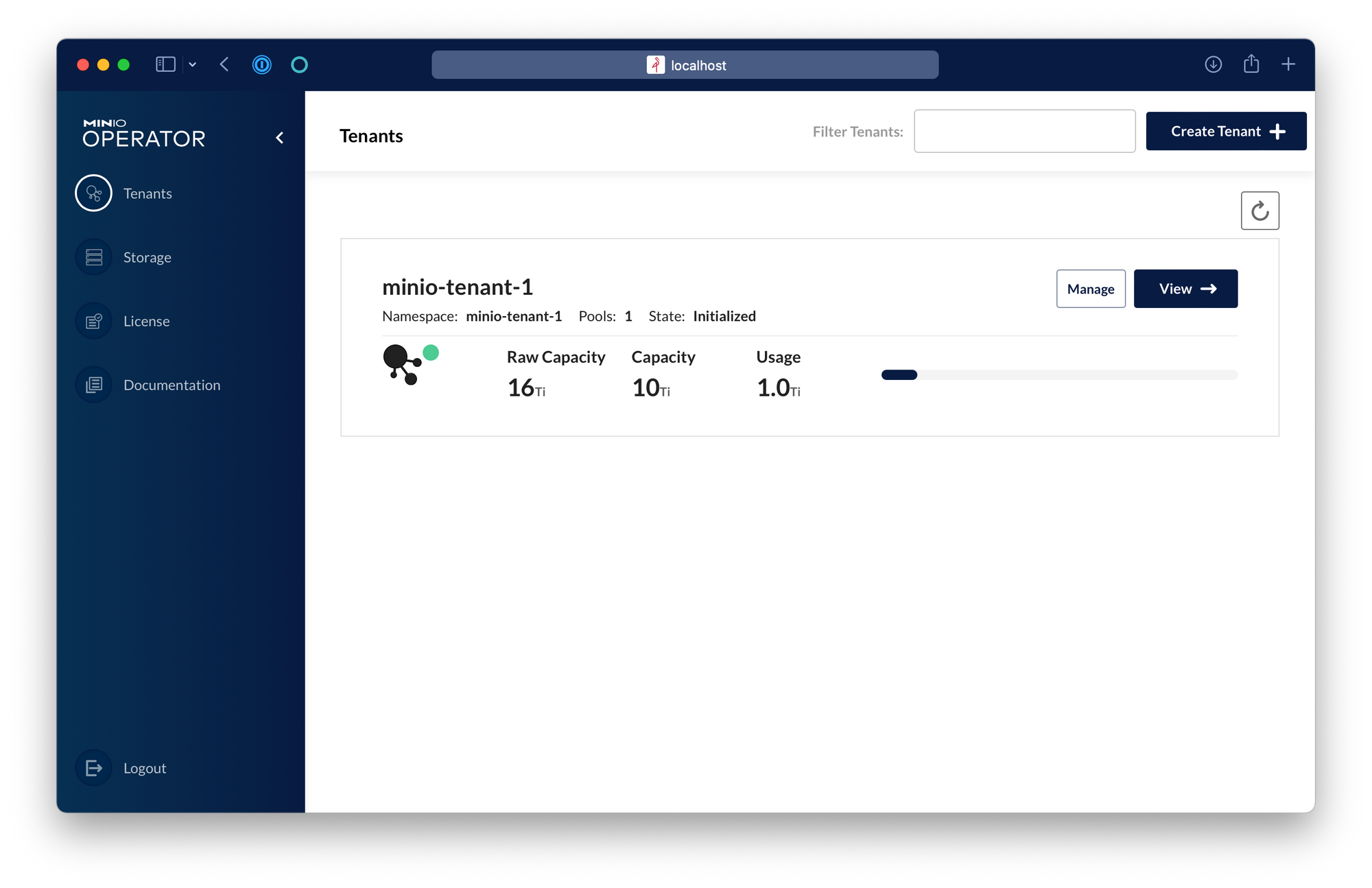 Inside the Operator UI we can see the tenant that we provisioned previously using the kubectl plugin.