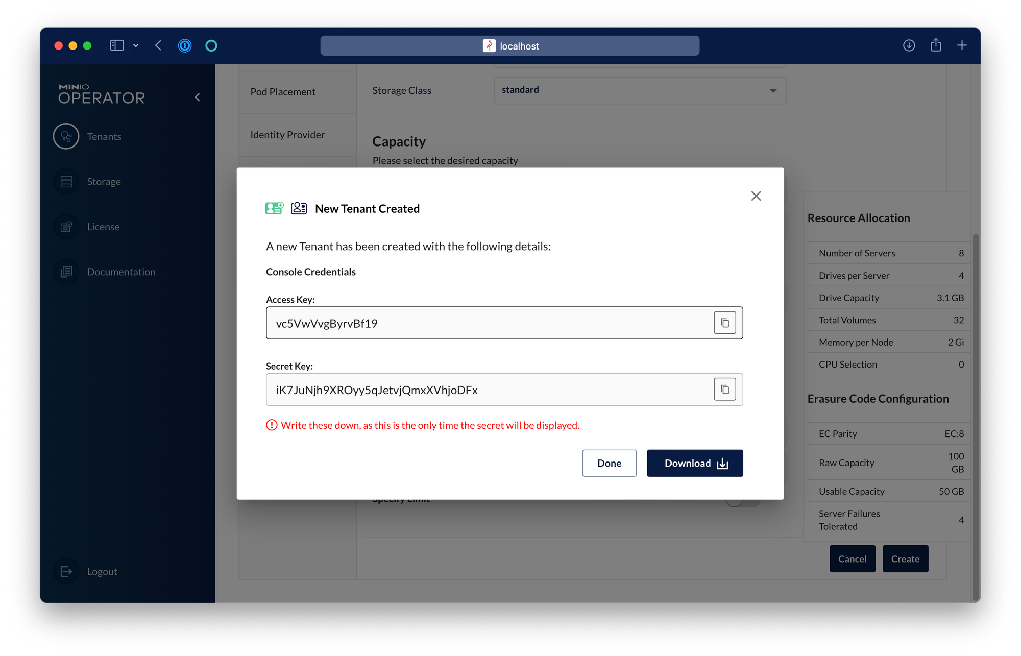 This command will output the credentials needed to connect to this tenant. MinIO only displays these credentials once, so make sure you copy them to a secure location.