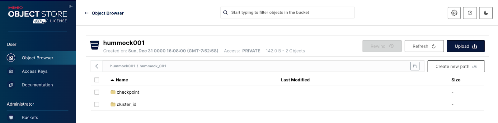 Access the MinIO web interface at http://127.0.0.1:9400. Use the default credentials (username: hummockadmin, password: hummockadmin) to log in. You’ll see that a bucket called hummock001 has been created.