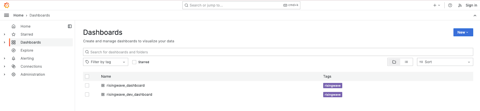 Access Grafana at http://127.0.0.1:3001/ navigate to the Dashboards menu on the left hand side. Find the risingwave_dashboard. In this dashboard, you have access to several internal metrics including node count, memory usage, throughput, and latencies. These metrics are valuable for diagnosing and enhancing the performance of your cluster.