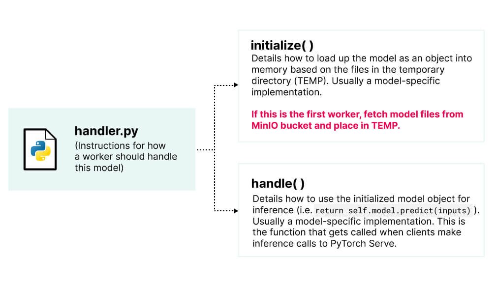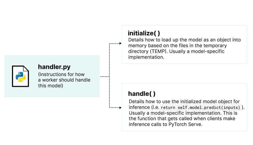 To facilitate this, we need to add a few lines of code to our model handler file. The handler file serves as an instruction guide for PyTorch Serve workers. The handler is responsible for two things: (1) initializing a model object and (2) handling an inference call:
