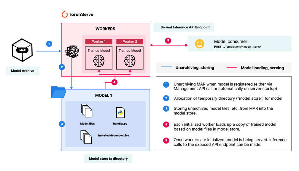 Normally, PyTorch Serve will allocate a temporary directory (we’ll call this TEMP) to hold all the files related to your model. Once allocated, TEMP will be populated with the unarchived contents of the MAR file: the model files, dependencies, and the handler file. When a worker is initialized, it will load up a copy of the model based on the files in TEMP into memory, thus becoming ready to handle any inference requests. This ‘vanilla’ process has issues (See above: PyTorch Serve and the problems with Model Archives).