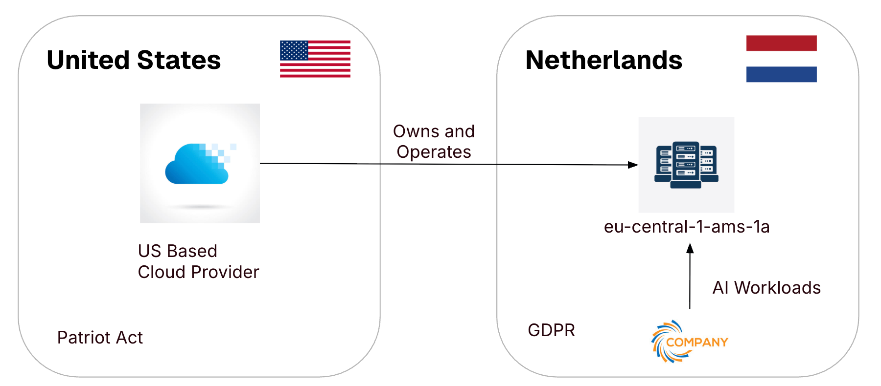 A common misconception is that a sovereign cloud is a cloud where all assets (physical, code, and data) are located within the boundary of some governing entity. While this is an important requirement of a Sovereign cloud, it is not the only requirement. One more key criterion for a cloud to be truly sovereign is that it must fall under the authority of only one government. To understand why this is necessary, consider the graphic below.