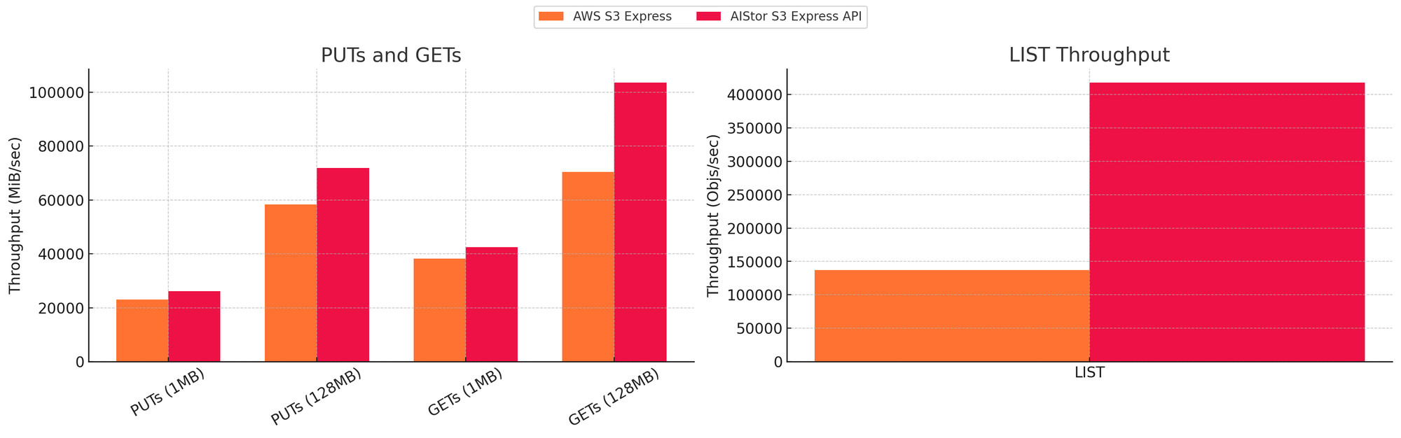 We’ve also compared the behavior of the S3 Express API on AIStor versus AWS S3 Express One Zone for PUT, GET and LIST performance, which show speed gains across the board and dramatic gains for large object GETS and LIST API calls.