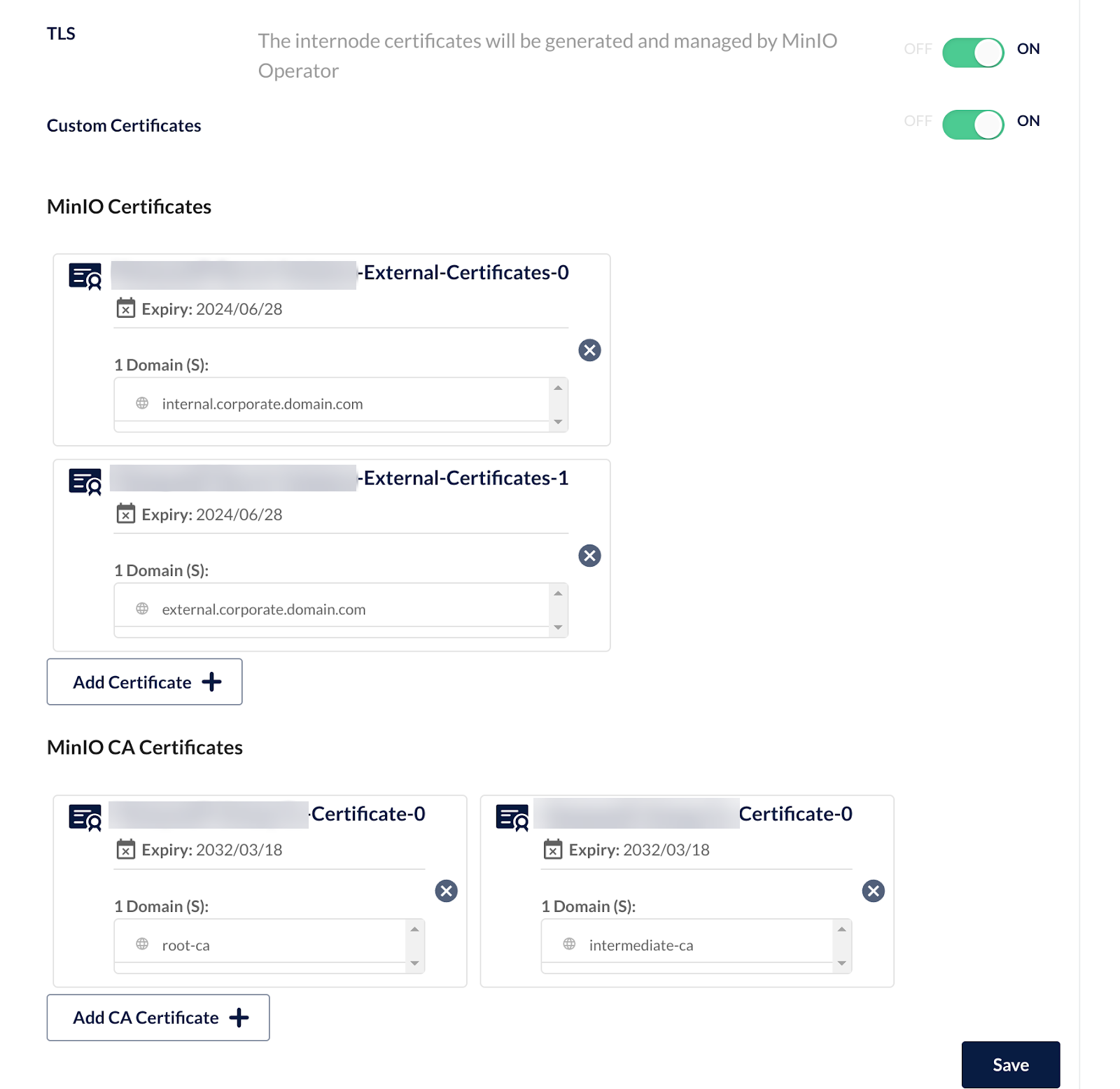In the Security menu, you can see MinIO Operator will automatically generate certificates to secure internode communications, but what about your internal and external domain certificates?