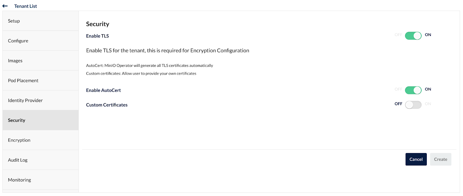 You can configure your tenant with details such as name, namespace, capacity, number of nodes, etc. You can explore the sub menus that contain additional options to tweak your tenant. Click on the Security menu.