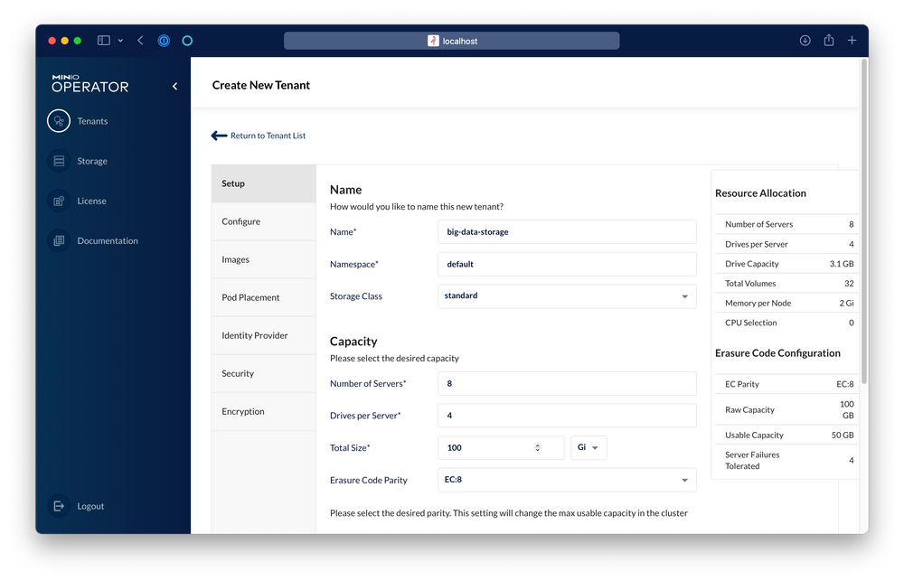 It is simple to create tenants either by command line or by graphical user interface. But there’s way more to object storage as a service than creating tenants. Each MinIO tenant has the full feature set available to it, is fully isolated, and separately configured. Multi-tenant with MinIO Operator is easy, repeatable, declarative, and can be updated without disruption while running each tenant in a separate namespace for security isolation. Now you have the power of hyperscale at your fingertips: Kubernetes manages the operations and configurations non-disruptively, with the tenant as the unit of scale.