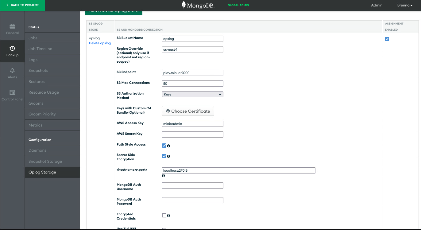 When you’ve configured correctly, your Oplog S3 storage panel should look similar to the screenshot below. You absolutely need your Oplog Storage to be a different bucket than your Snapshot Storage. All the other required fields should be familiar to you from the Snapshot Storage configuration panel.