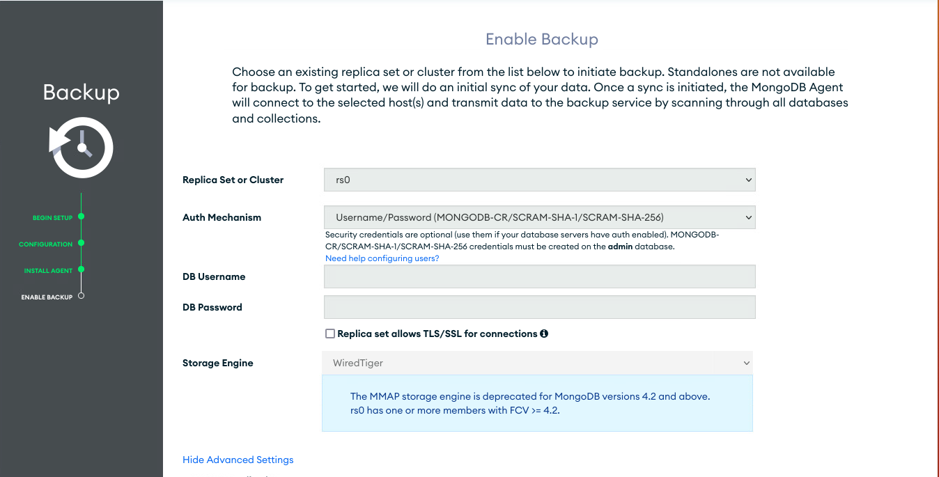 You’ll first be asked to enable a HEAD directory if you haven’t already done so. This can be done in Admin under the Backup Initial Configuration. The default directory is the dbpath of your replica set.