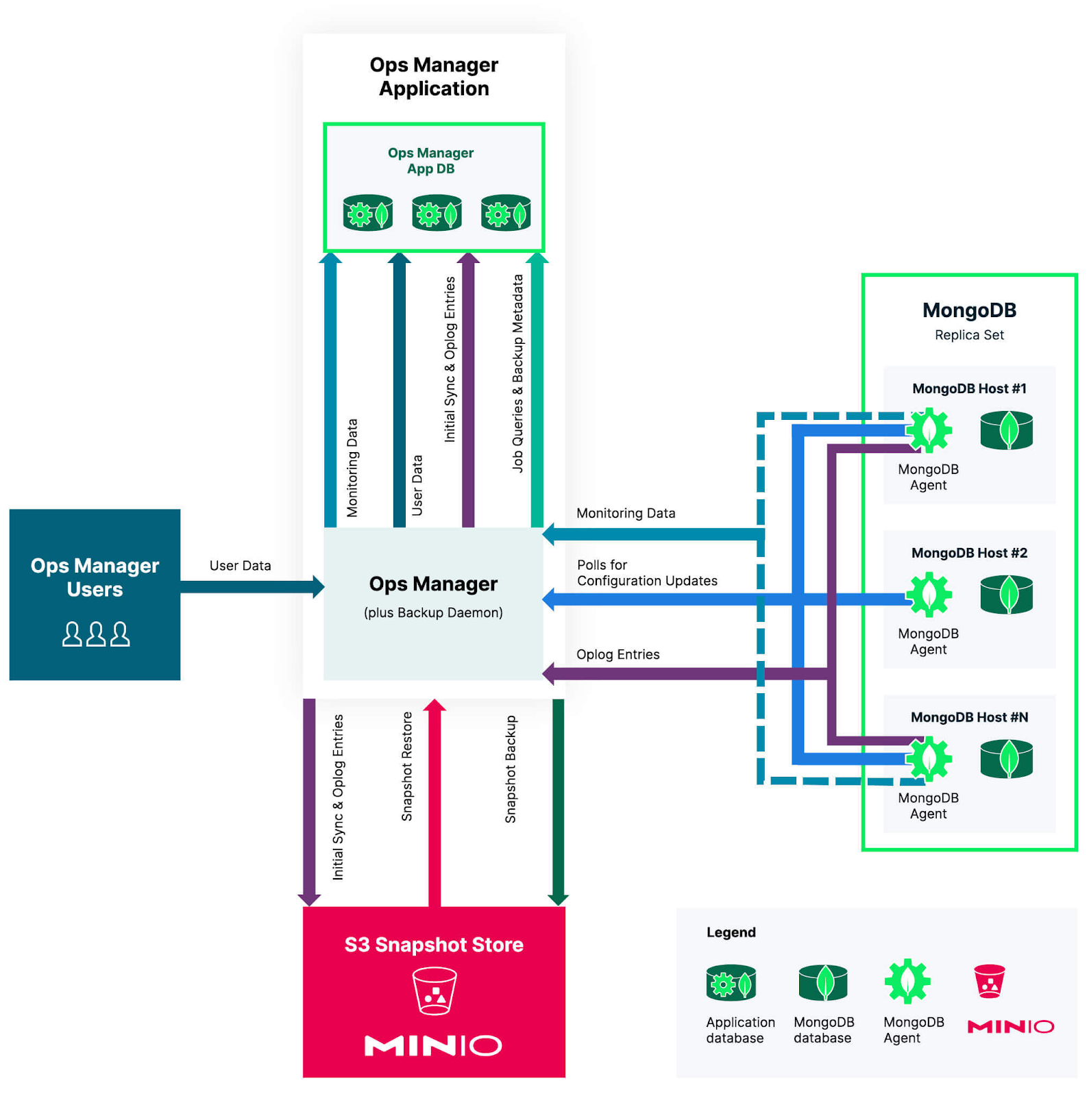 Ops Manager enables you to restore data from either a complete scheduled snapshot or from a specific point in time between snapshots, for both sharded clusters and replica sets. Snapshot-based restoration is the simplest method and involves Ops Manager directly reading from MinIO.