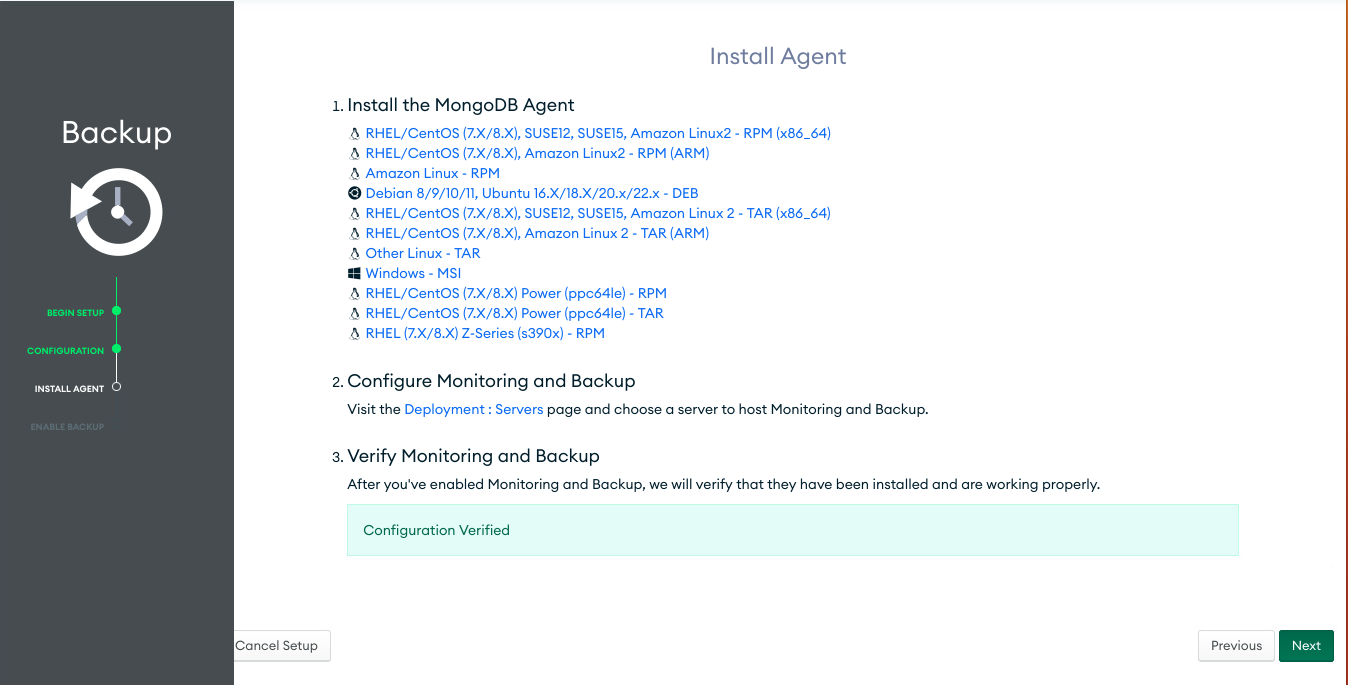 You’ll need to install the MongoDB Agents first. We assumed earlier in the tutorial you had already done this, but if you haven’t yet you must now. The minimum requirements are one instance of Monitoring and one instance of Backup. In production, these two should be activated on the same server, and that must be a different server than the mongod instances that will be monitored.