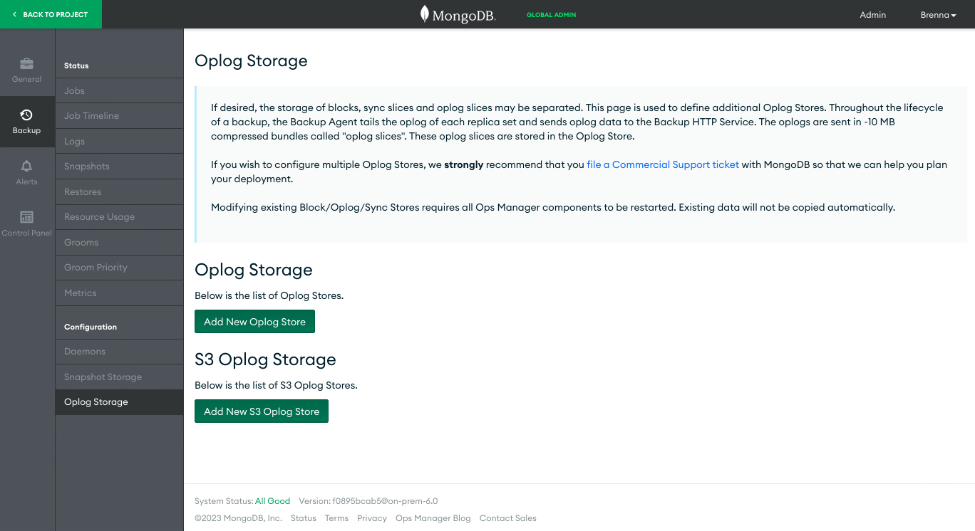 While the necessity of a bucket for Snapshot short seems obvious, an Oplog Storage option might not be. As explanation and recap of the workflow outlined earlier, MongoDB Agent constantly monitors your replica set and tracks any changes in the Oplog (operation log) of the primary replica set. The other replica sets copy and apply these changes to their own Oplogs. MongoDB Agent tails the Oplogs of all the replica sets and then transmits these new Oplog entries to Ops Manager. These Oplog entries are sent in compressed bundles called Oplog slices that require storage in order for Ops Manager to function.