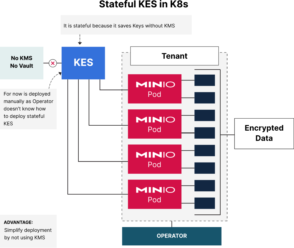 Implementing KES within Kubernetes in a stateful configuration ensures the persistence of encryption keys through pod lifecycle events and restarts. This setup offers an architectural resilience that is especially crucial in environments where relying on external Key Management Systems (KMS) is not an option or preferred.