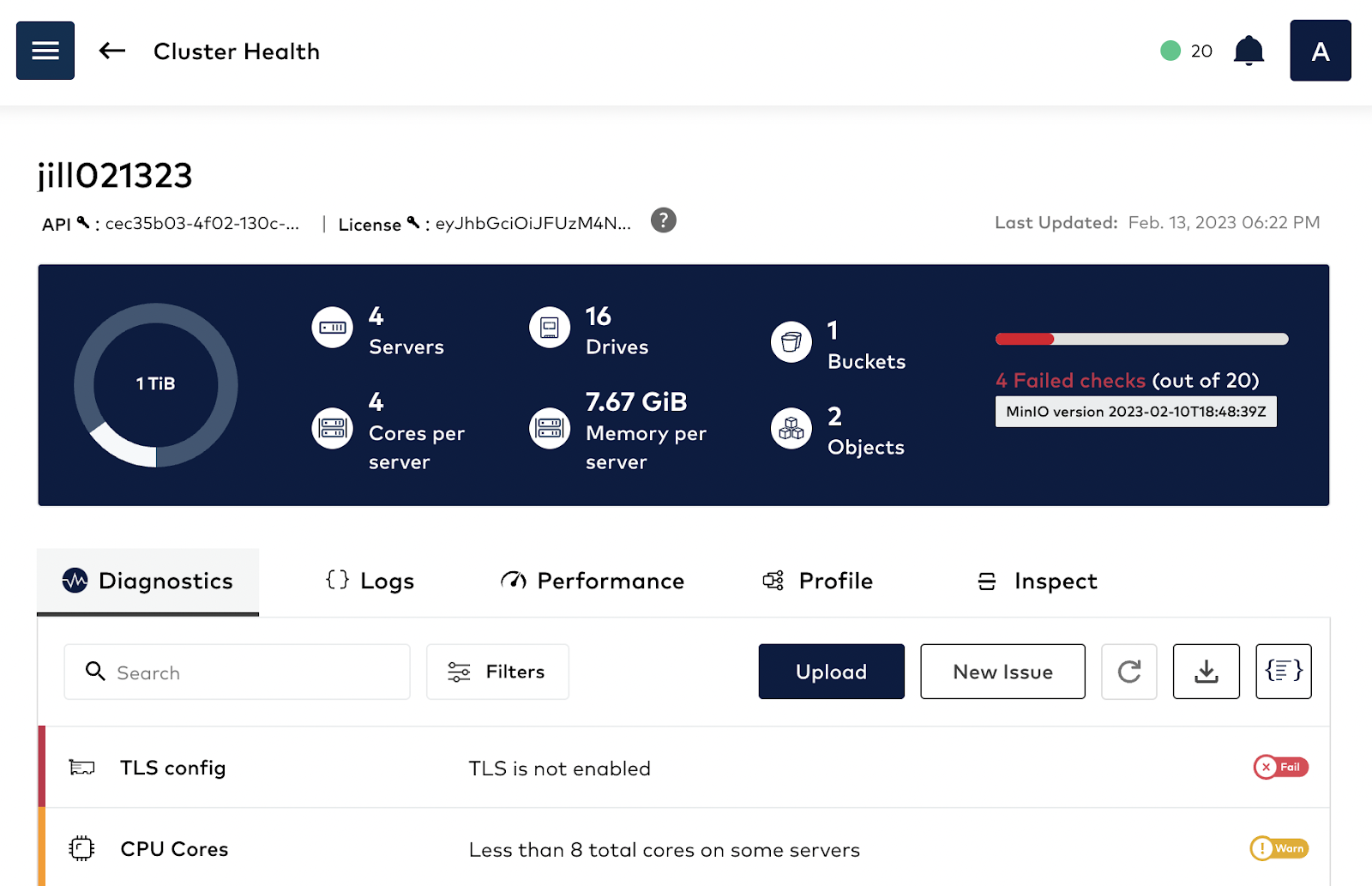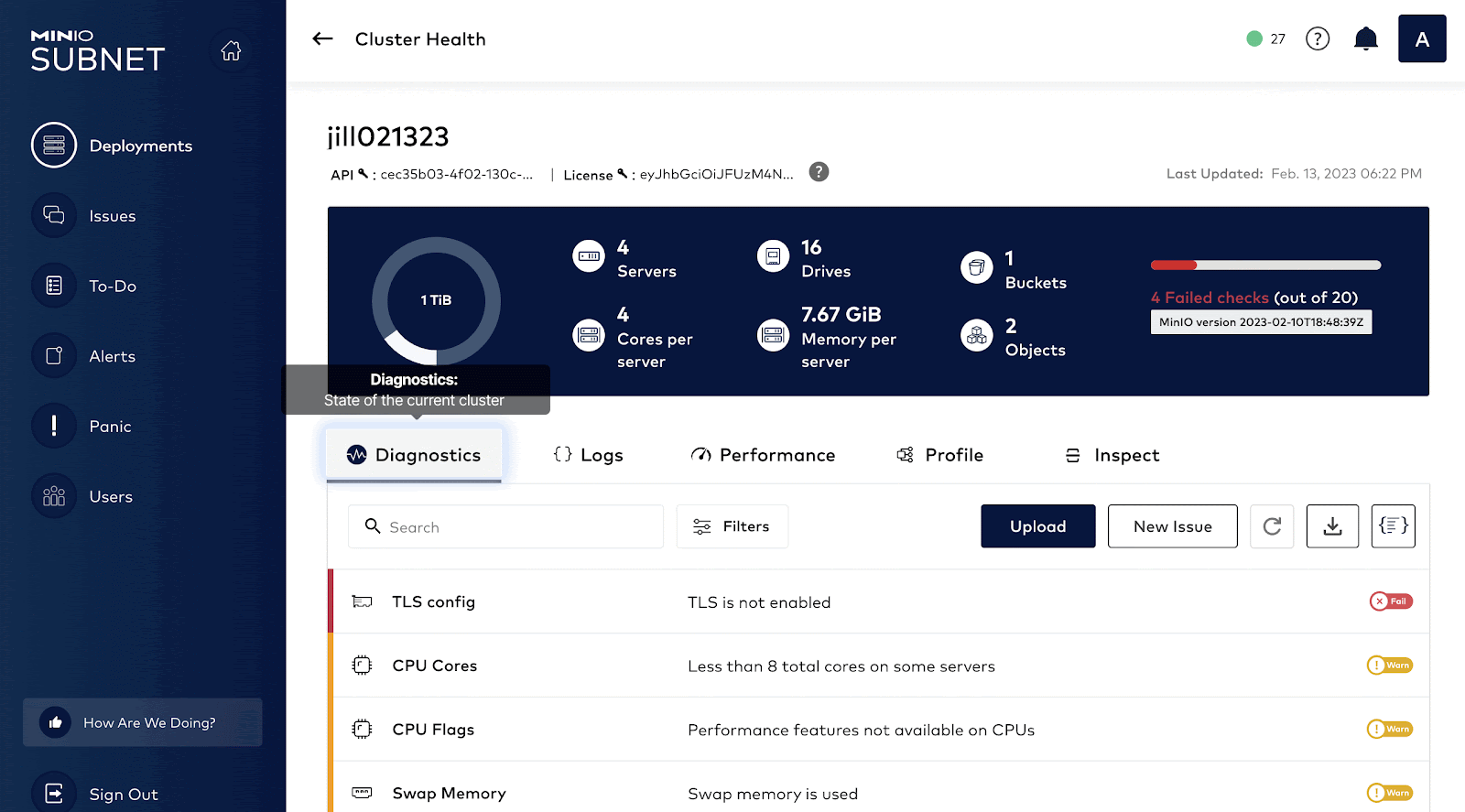 In this post we went into as much detail as possible of what is involved in a HealthCheck. We showed you the different components of the diagnostics, how logs can be piped from the cluster, running network/drive/object performance tests, along with profiling and inspecting objects and clusters. With the Enterprise License you will be able to use the `mc support` command to send this information once or periodically – it’s up to you. You can also upload this information manually to the SUBNET portal after running the same commands in airgap mode. In this exercise we showed you how to do this automatically and push results directly from the cluster.