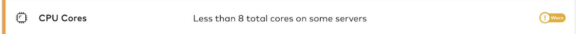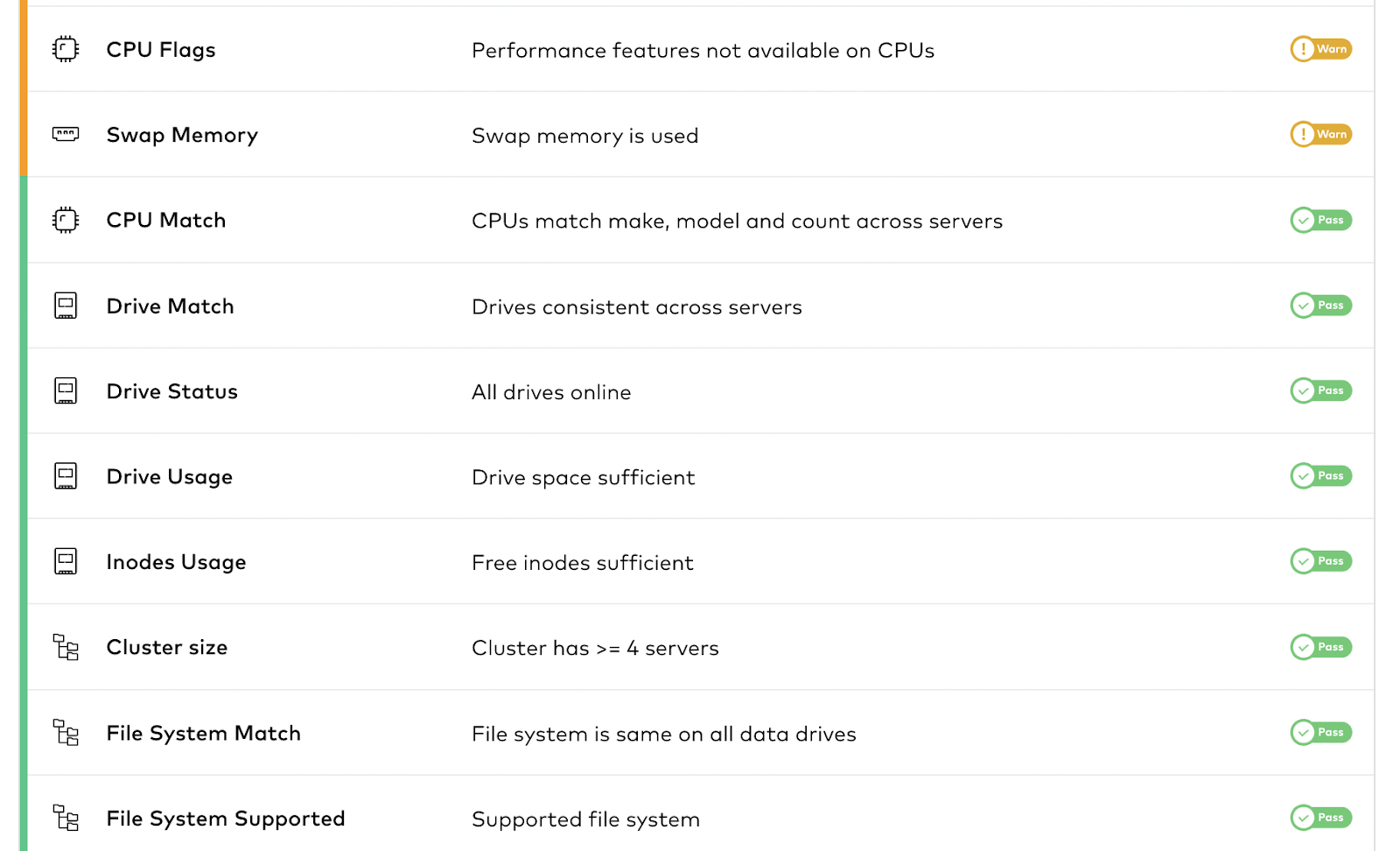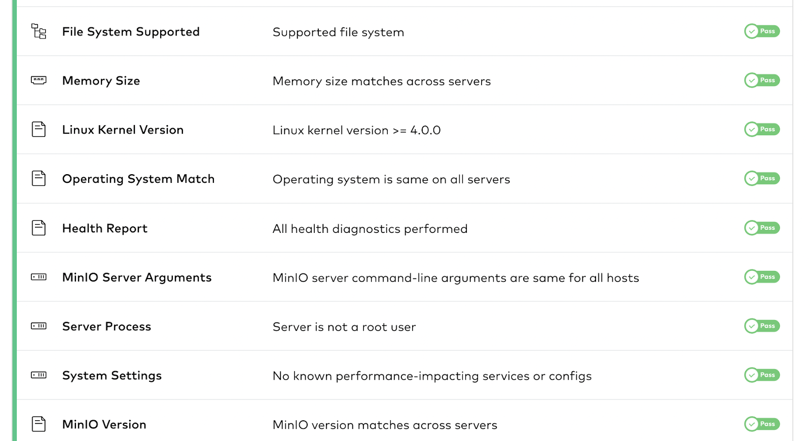 MinIO recommends a minimum of 8 CPU cores on the nodes where MinIO is running to ensure the infrastructure is not underpowered. Generally, if you have less than 8 total cores on servers, this will show a “Warn”. It's paramount that within the same pool the same set of nodes are configured so they are as homogeneous as possible. Here is MinIO’s recommended hardware checklist that goes into detail about some of these hardware requirements.