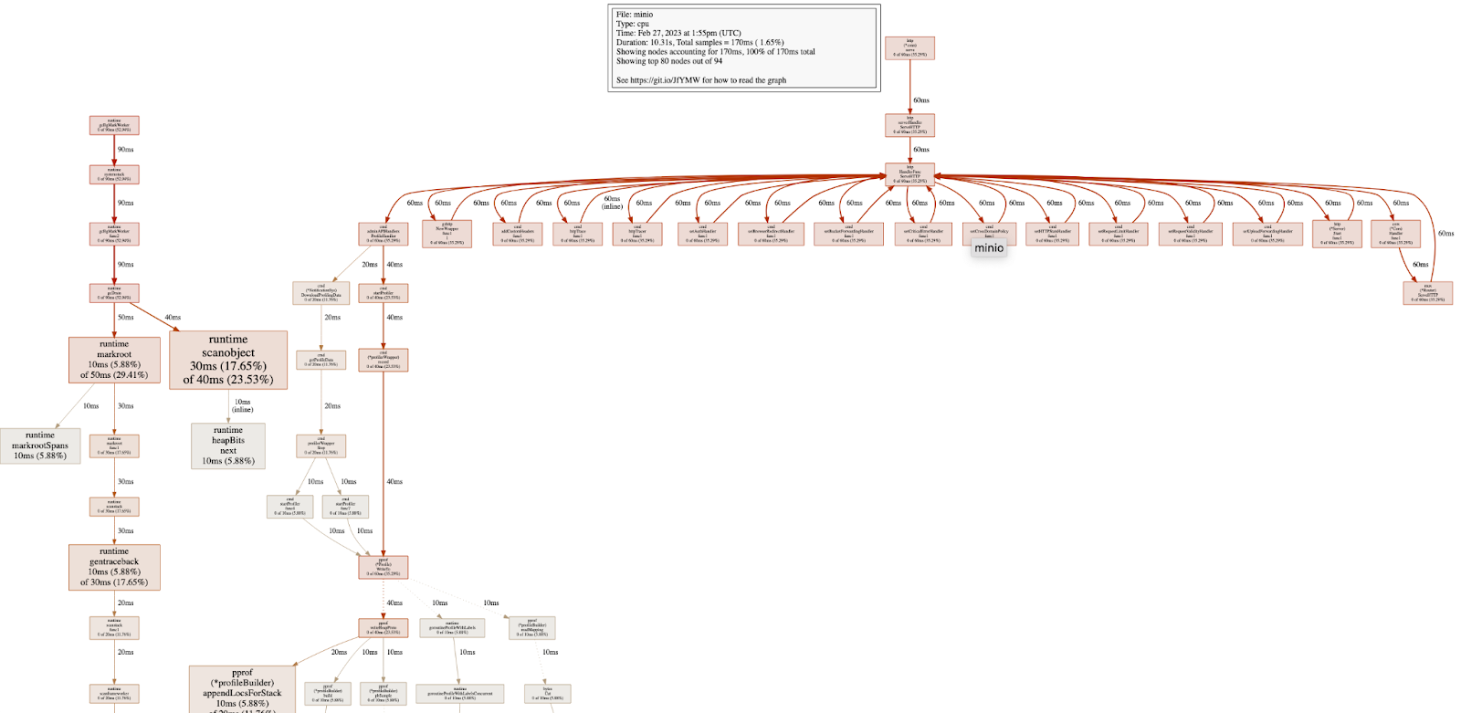 Below is an example of the CPU profile. If you click on the other boxes you should see the other profiles too. Here you can check all sorts of details, but most importantly it lets MinIO engineers who wrote the code see exactly what is happening and where to target bottlenecks in CPU or in the GO runtime itself.