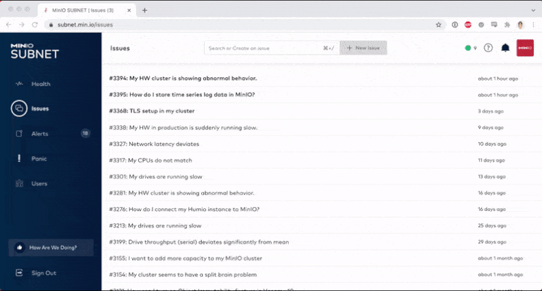 While the MinIO Subscription Network has all sorts of features (which we will detail in future posts) the core mission is to create a communication platform unlike anything else. We view supportability as a software problem and our approach to the communication aspect of it reflects that. We have built features that reduce friction, encourage discussion and reward sharing of information. We also put software engineers on the job - because supportability as software doesn’t mean supportability doesn’t have a human component. It does and it should and that human component should get at the root issue in a fraction of the time of someone who is only passingly familiar with the code.