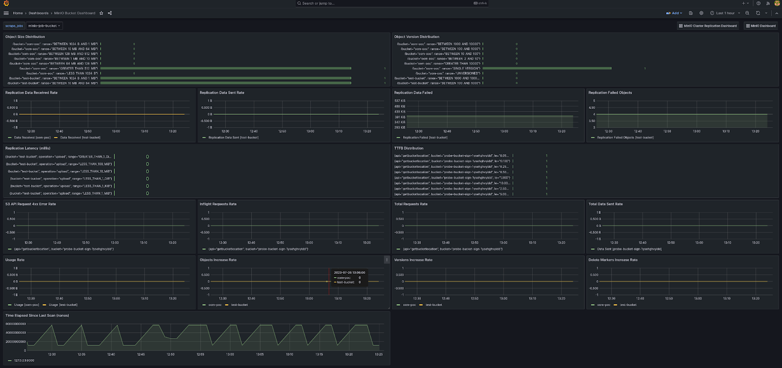 The following query examples return metrics collected by Prometheus every five minutes for a scrape job named minio-job: