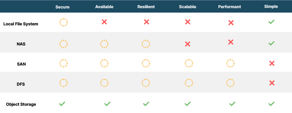 Ultimately, the choice of storage options will be informed by a mix of requirements, reality and necessity, however, for production environments, there is a strong case to be made for object storage.