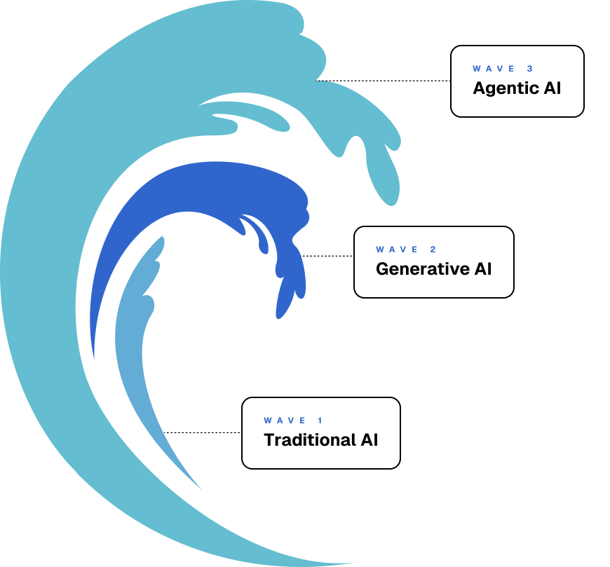 The second wave of AI brought us generative AI, which generates new content. This can take the form of answering a question, summarizing a long, complex document or even a full conversation at a fluency level capable of passing the Turing test.