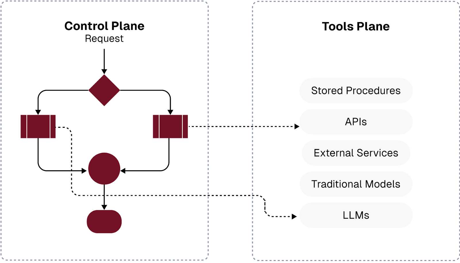 All business processes can be broken down into two planes: a control plane and a tools plane. See the graphic below. The tools plane is a collection of APIs, stored procedures and external web calls to business partners. However, for organizations that have started their AI journey, it could also include calls to traditional machine learning models (wave No. 1) and LLMs (wave No. 2) operating in “one-shot” mode.