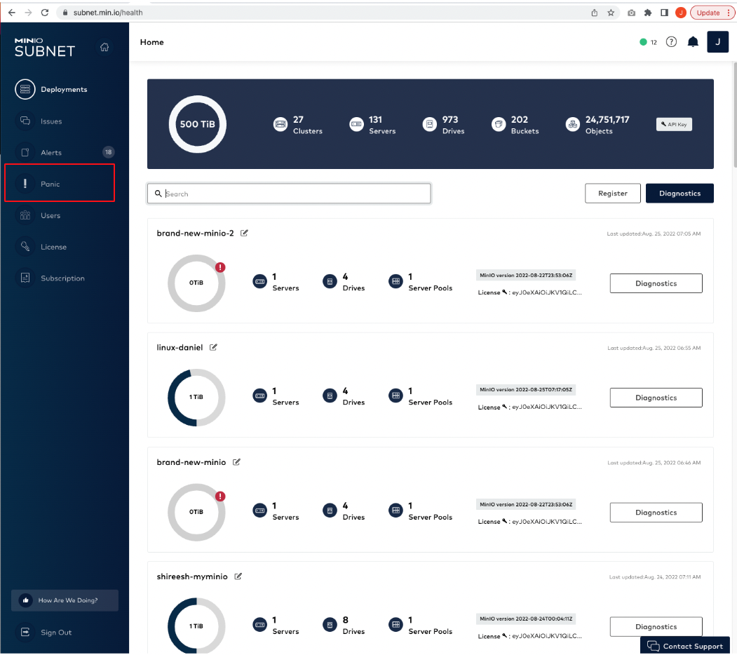 The Panic Button is just one feature of MinIO’s SUBNET portal. Others include direct-to-engineer communication, health checks, speedtest diagnostics, optional call home capabilities. The list is long.