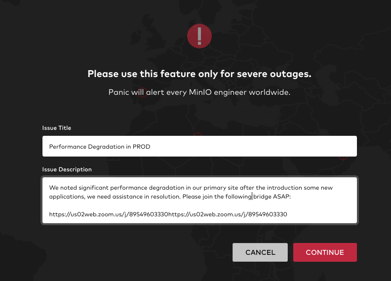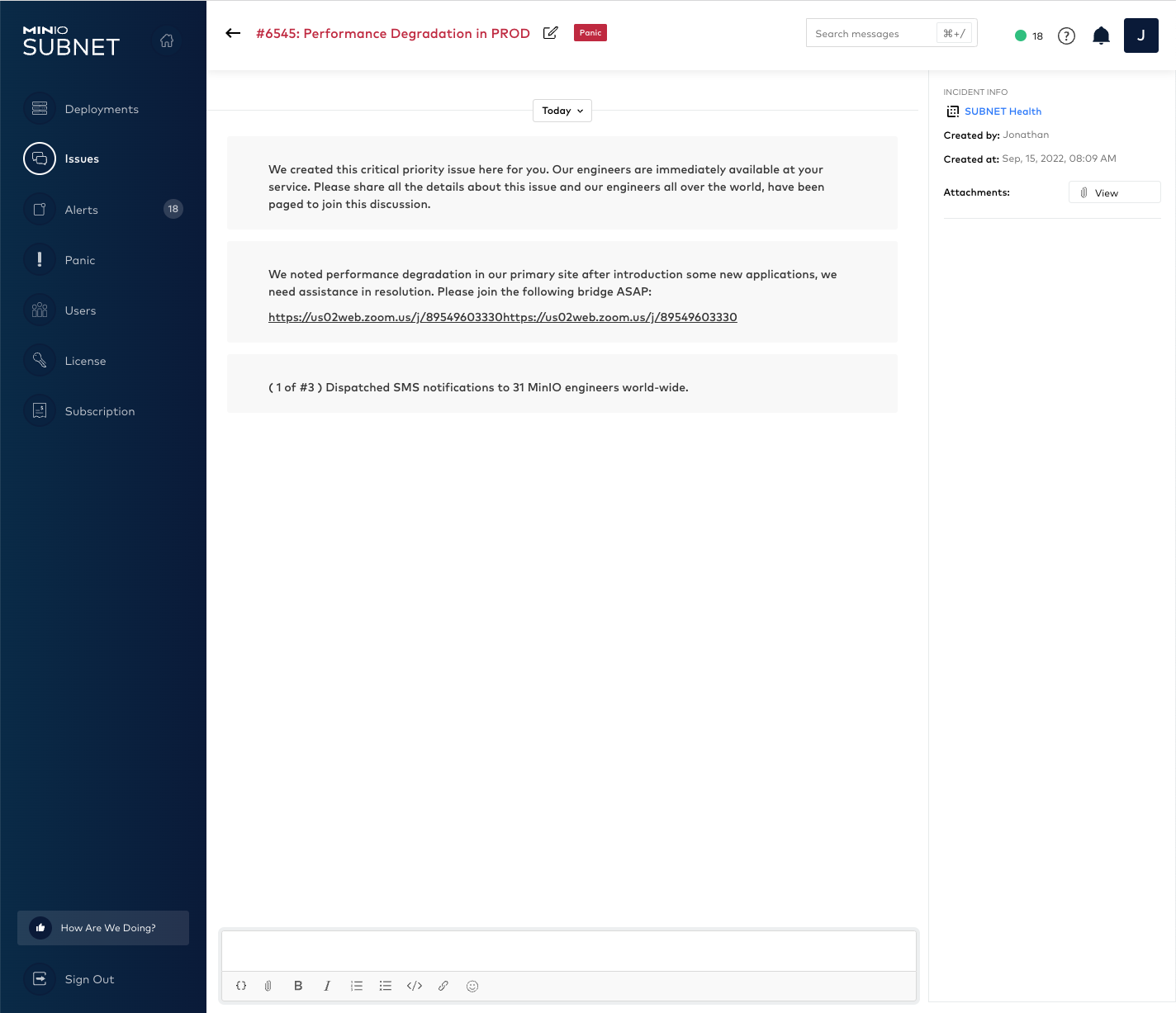 Again, the Panic Button is but one feature of SUBNET. You need to experience all of them to appreciate why our customers are so loyal and why MinIO grows so quickly within the enterprise. There are no limits on seats, no limits on issues and we make it better with every release. To learn more, reach out to us at hello@min.io and we will get you a private tour.