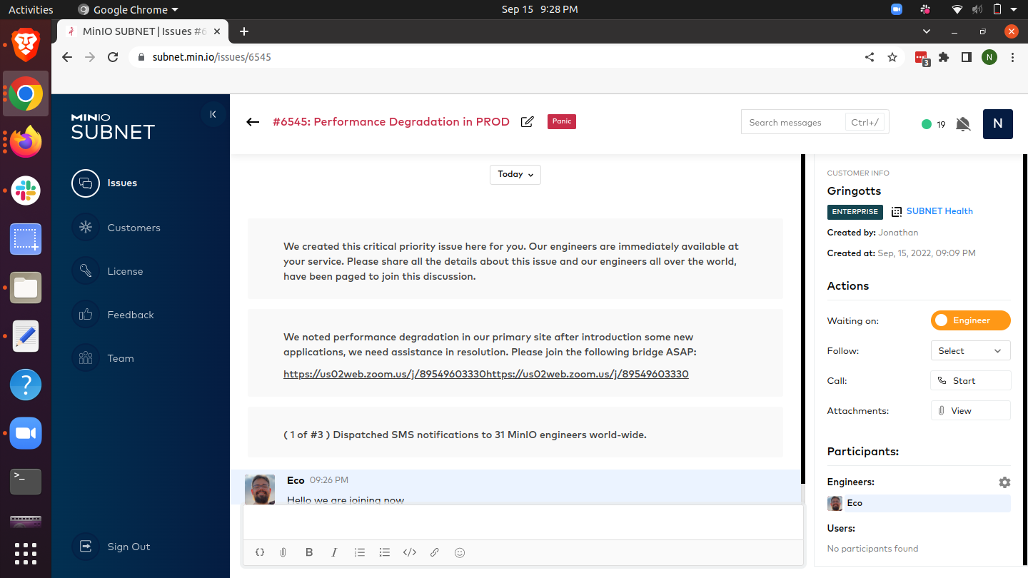 Then everyone with a SUBNET account at MinIO (which is almost the entire company) get a message like this: