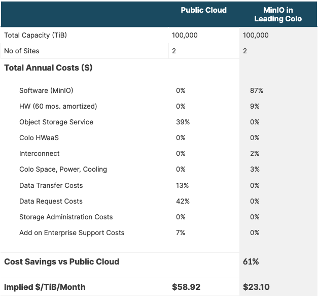 - Implied $/TiB/Month: This is the fully loaded cost (for 100PiB) per TiB per month for using two regions vs running MinIO in two colos.
