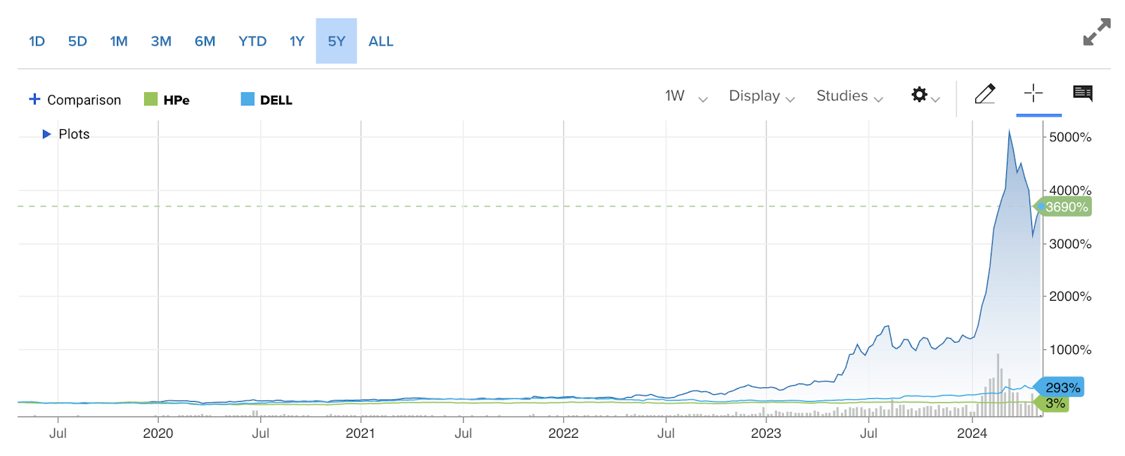 Supermicro’s pricing can’t be beat. That is not to say that Dell, HPe or others don’t win deals, they do - what it says is that if optimizing for the price/performance frontier is a primary consideration and the volume is significant, Supermicro almost always wins. We know, we have been in those large volume deals with them - the other guys know they are going to lose. They talk about the “relationship” or spread FUD around quality and support. It doesn’t matter - that is why Supermicro’s stock price looks like a hockey stick in comparison (yes, you have to look really hard to find them…).