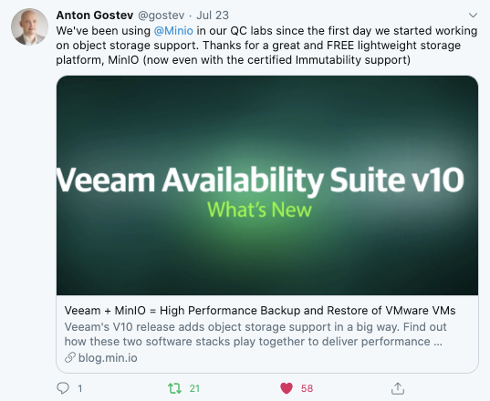 - Veeam: Backups are big business and Veeam is the leader. They have a huge push for S3 endpoints. This is because they are superb at listening to their 350,000 customers - all who want object storage's legendary scalability and resiliency. While "on the record" Veeam doesn't play favorites - truth is they use us internally and are huge fans. MinIO is one of their favorites: