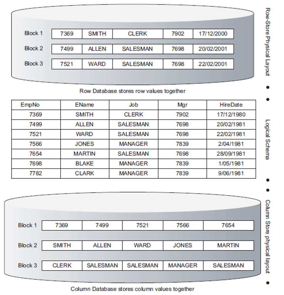 The first is a transactional query. It has to scan every row on the table and find out the name of the employee wherever the job is clerk. The second is an analytical query - rather than an atomic result, the goal is a general result. Unfortunately, the first and second query has to scan through all the rows, if we use RDBMS way of representation of data. If the size of data is 20 GB, all the 20 GB more or less will be scanned. This is the top part of above figure.