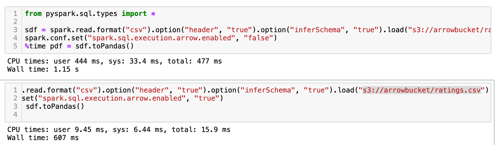 Use your favorite Python editor, and write some code. First, let us start with Spark reading the file and converting it to a dataframe, with and without Arrow enabled options.