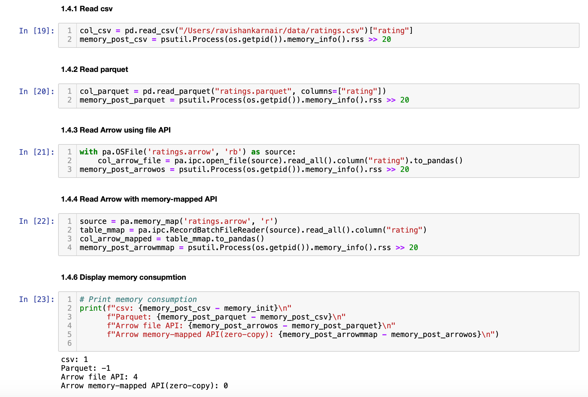 We are reading different file formats and seeing the memory consumption for each. As it is evident, Arrow format based files are zero copy - almost no memory consumed at all.