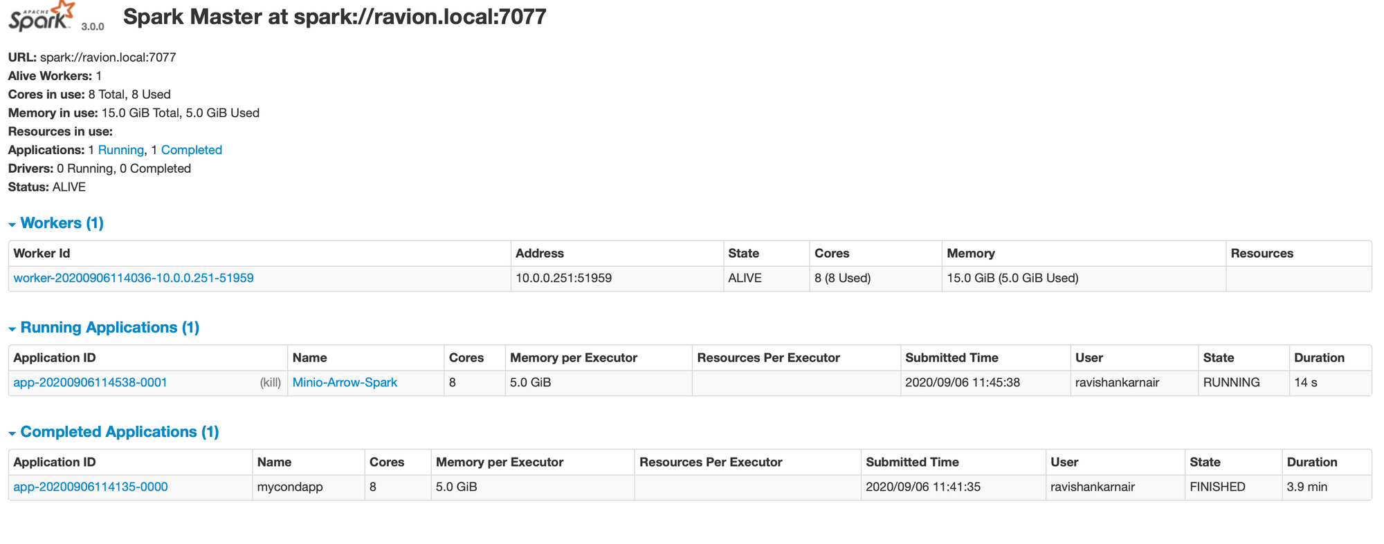 Start your Spark cluster. Complete the code with all settings and check whether we created the Spark context successfully. To ensure that our app (named Minio-Arrow-Spark at line 8) is connected, just check the Spark UI. You should see something like this: