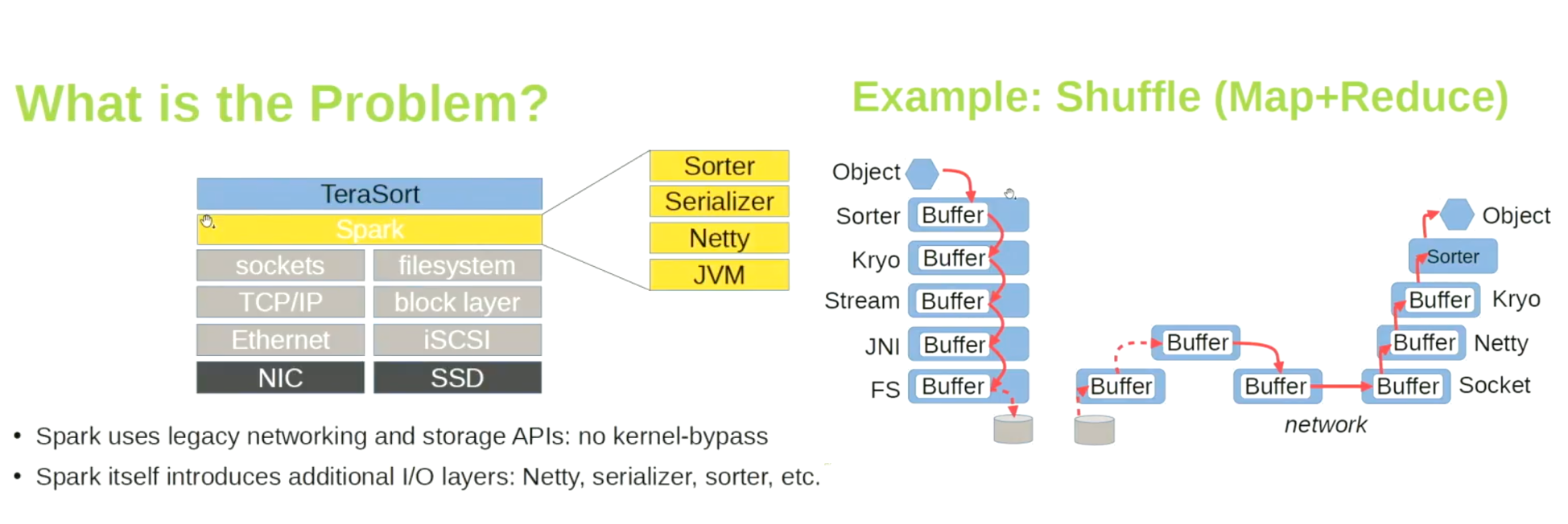 The issues are with the way in which Spark is retrieving the data. Look at the number of layers the data has to pass though. This creates a limit on the throughput that we can achieve. There are projects like Apache Crail, which are designed to address these issues.