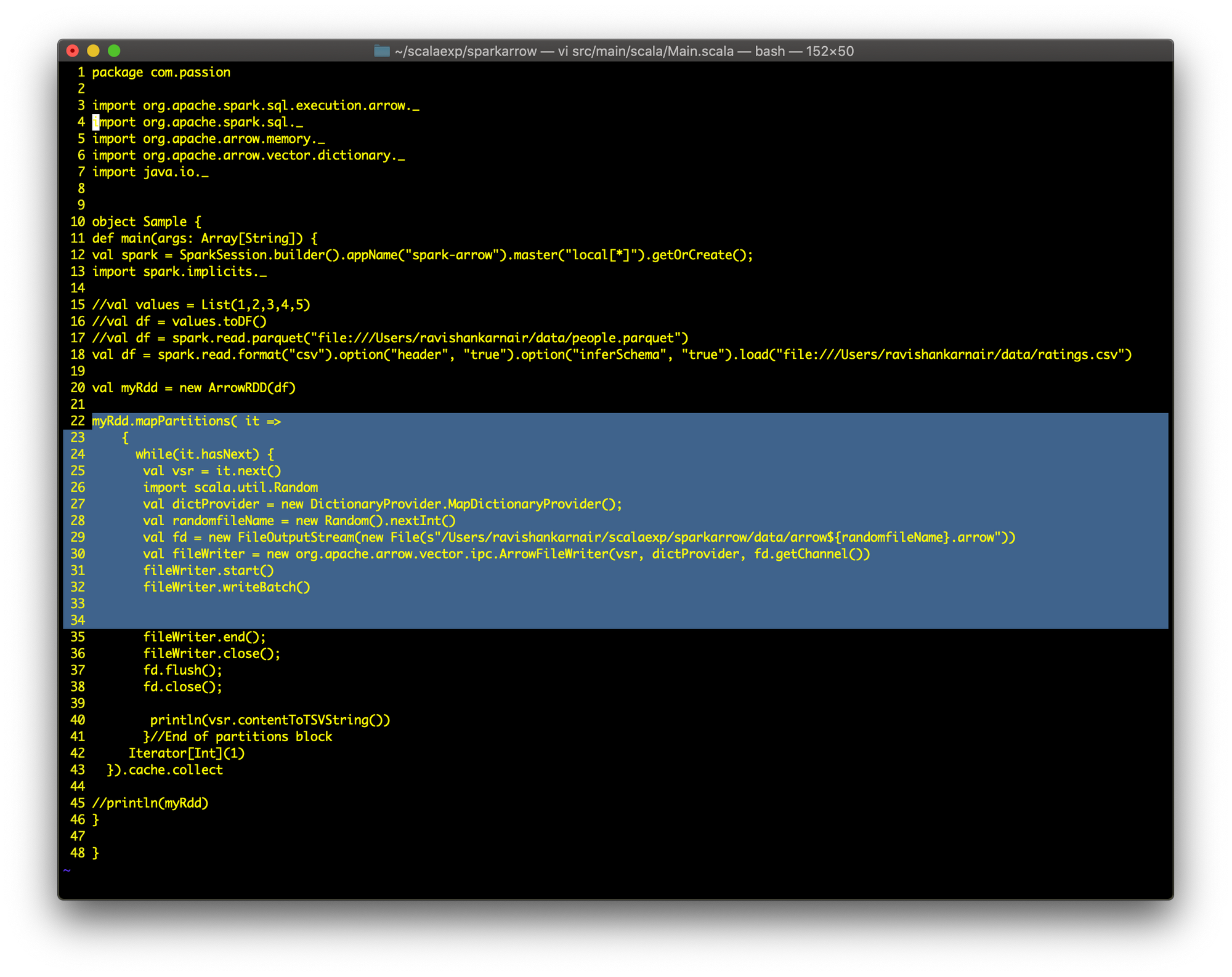 We will start with a a .csv file, in this case movie ratings downloaded from the movielens site. For illustration purposes, I took about 100K rows. First, let's write a Spark program to read this CSV file and write it into Arrow format using Arrow RDD. You can get the full code from the link given towards the bottom of this article.