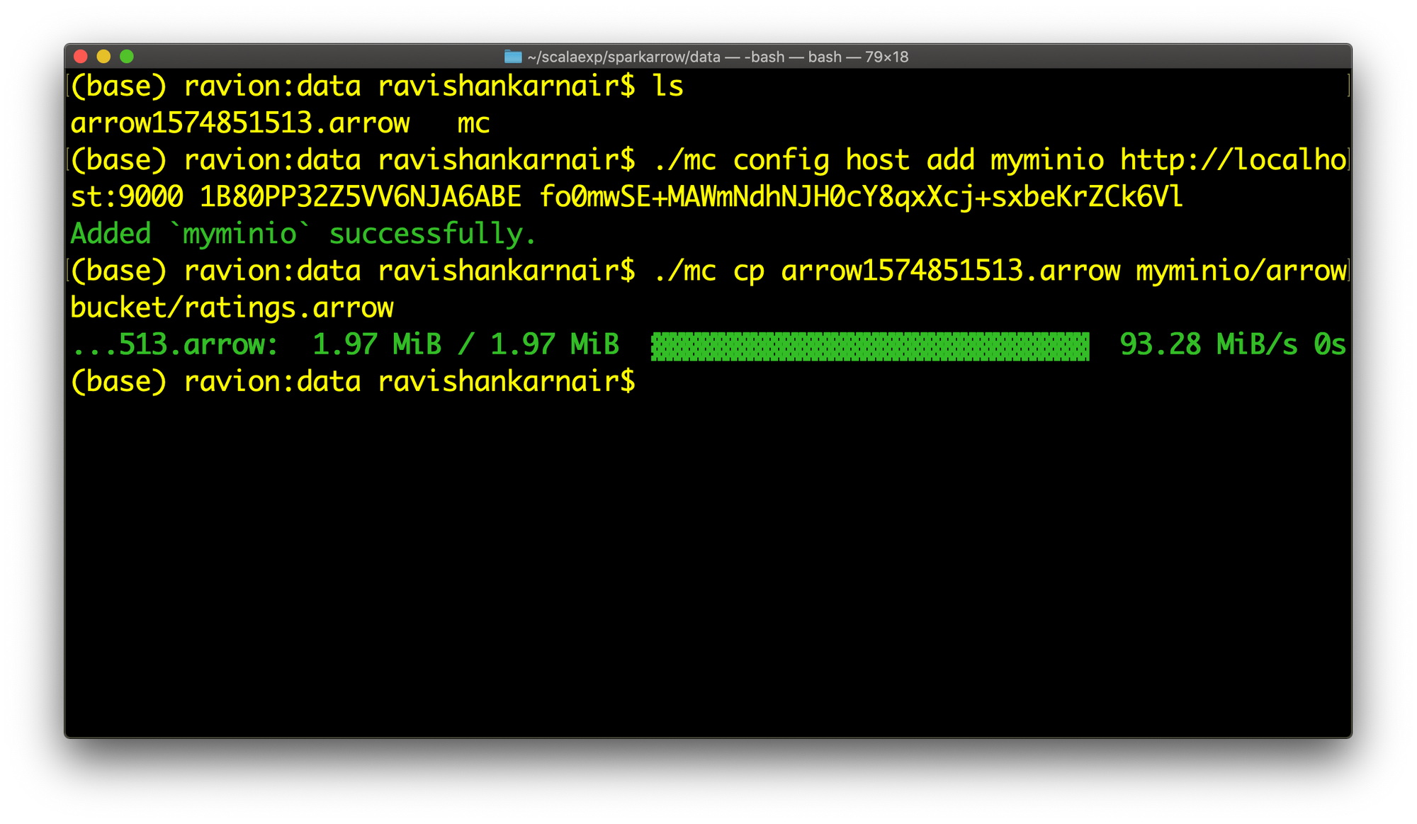 As you see from code, the Arrow format file is is generated in data directory. Let's copy it to the MinIO bucket we created earlier (bucket name is arrowbucket)