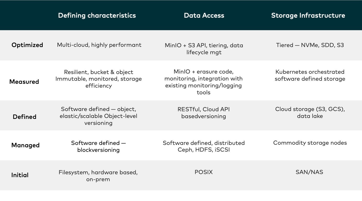 Fast forward two years and I am privileged to have joined MinIO, a leader in software-defined data storage. MinIO delivers high performance, S3 compatible object storage across Kubernetes, public and private clouds, and virtualized environments. Having settled in, I went searching for a DevOps maturity model that addressed data access and storage infrastructure and was surprised not to find an equivalent framework. Antiquated data access and storage infrastructures can be the weak link for cloud native applications.