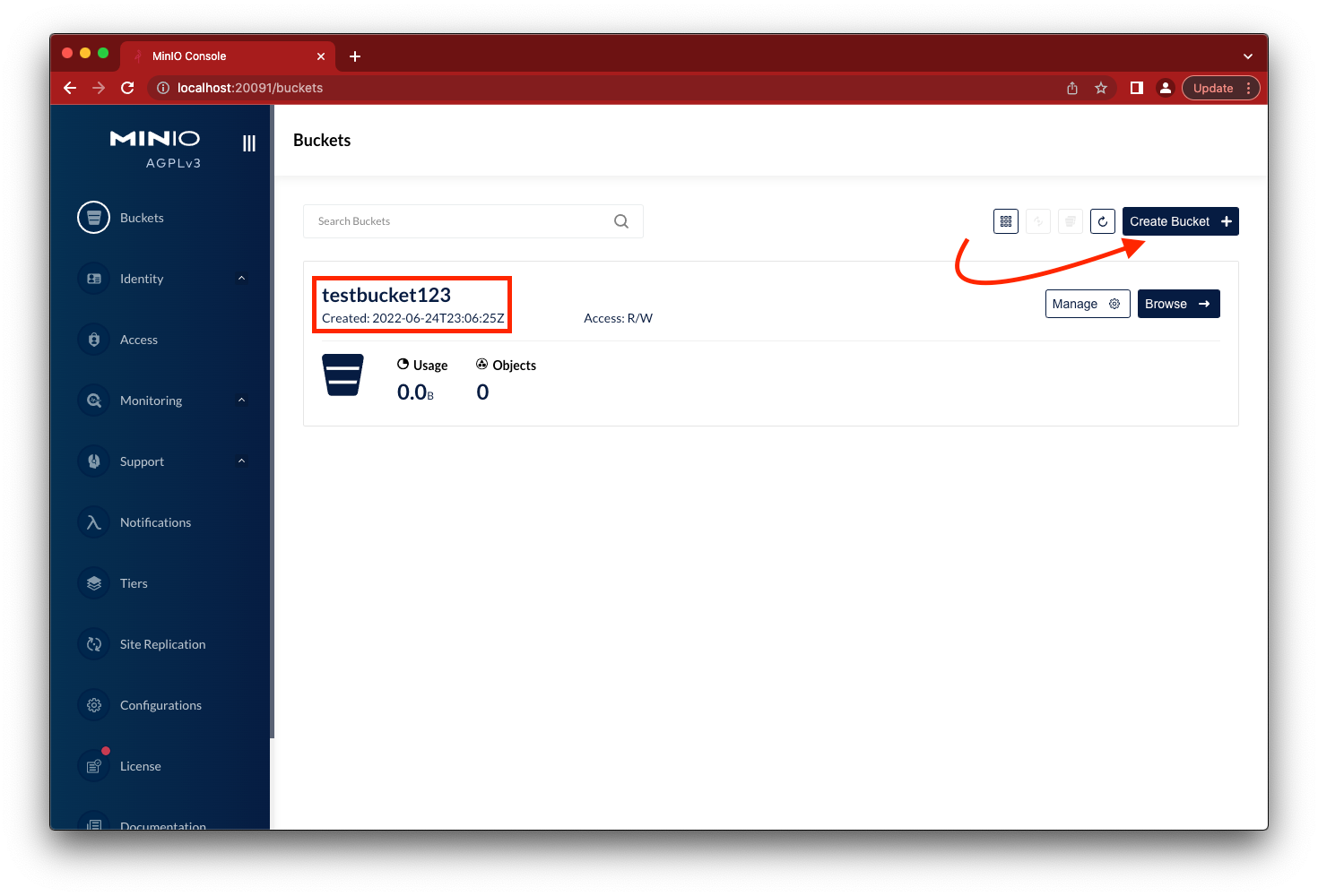 Go to the browser to load the MinIO console using http://localhost:20091, login using minioadmin and minioadmin for username and password respectively. Click on the Create Bucket button and create testbucket123.