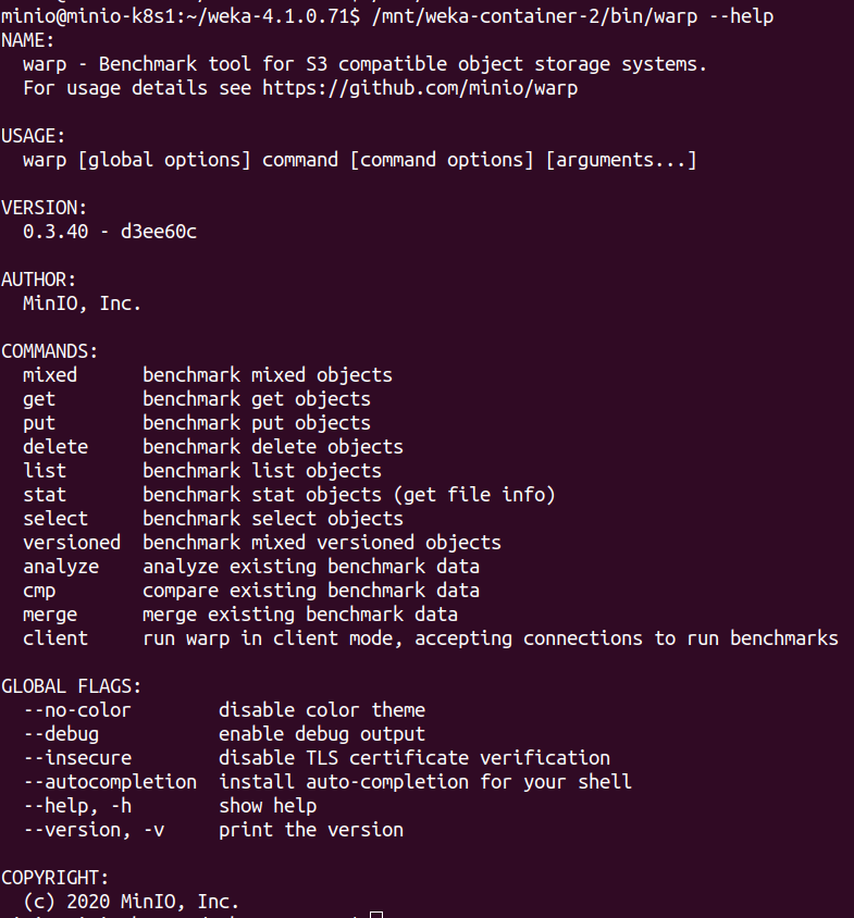 Weka is one such company and as you will find below, they are distributing the entire MinIO binary in their product, without attribution, to implement their object storage functionality. Weka’s violations include the server, the client and even the WARP benchmarking tool. Confusingly, Weka’s advertising claims its unacknowledged redistribution of MinIO software is somehow faster than MinIO.